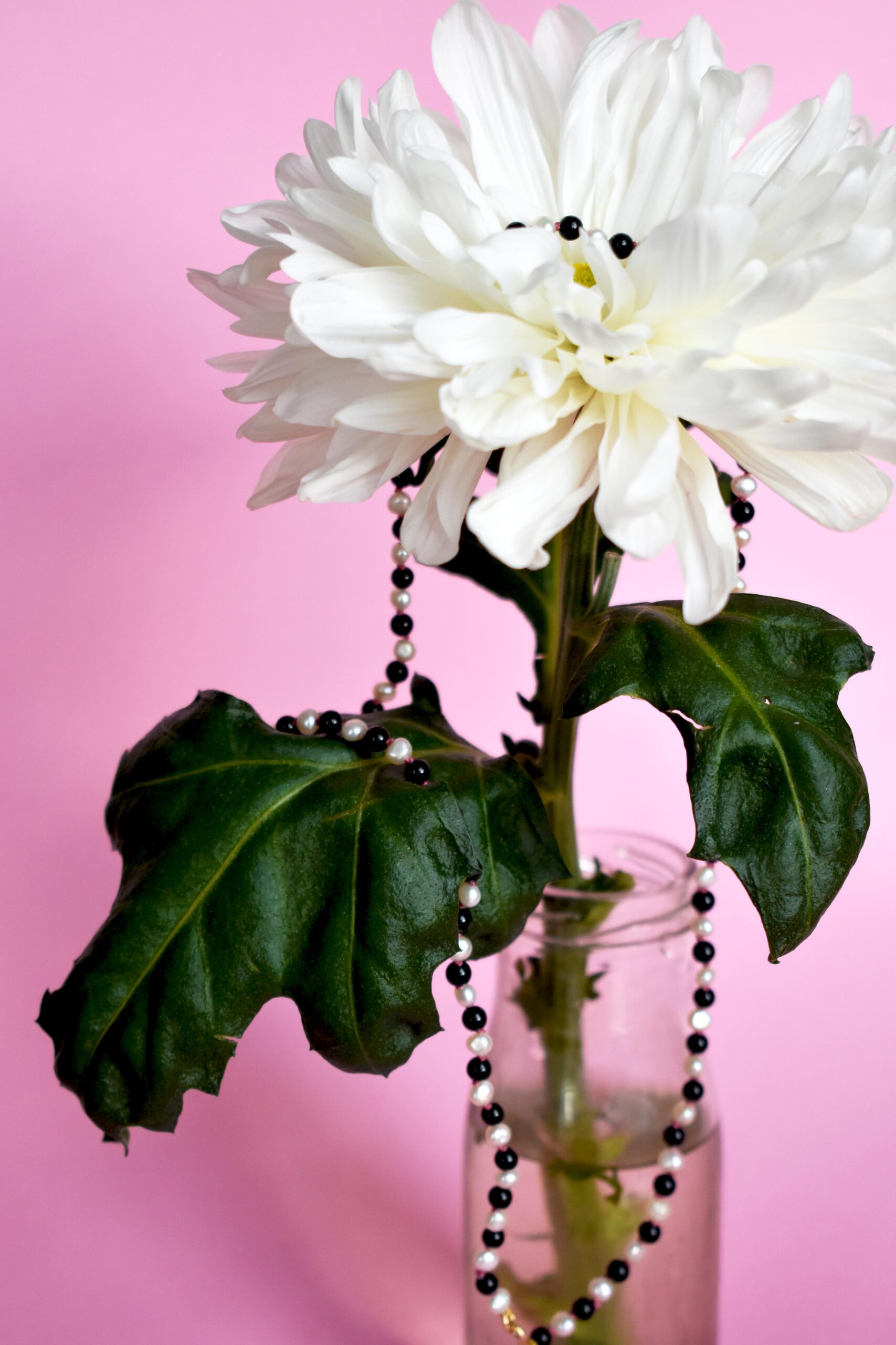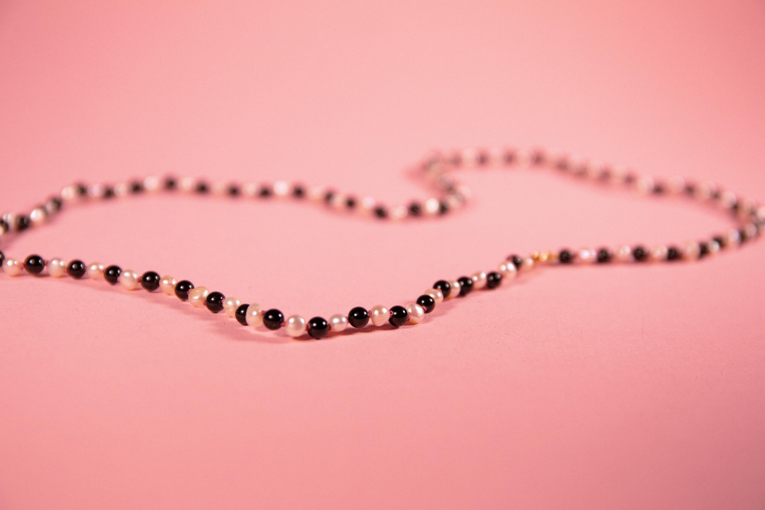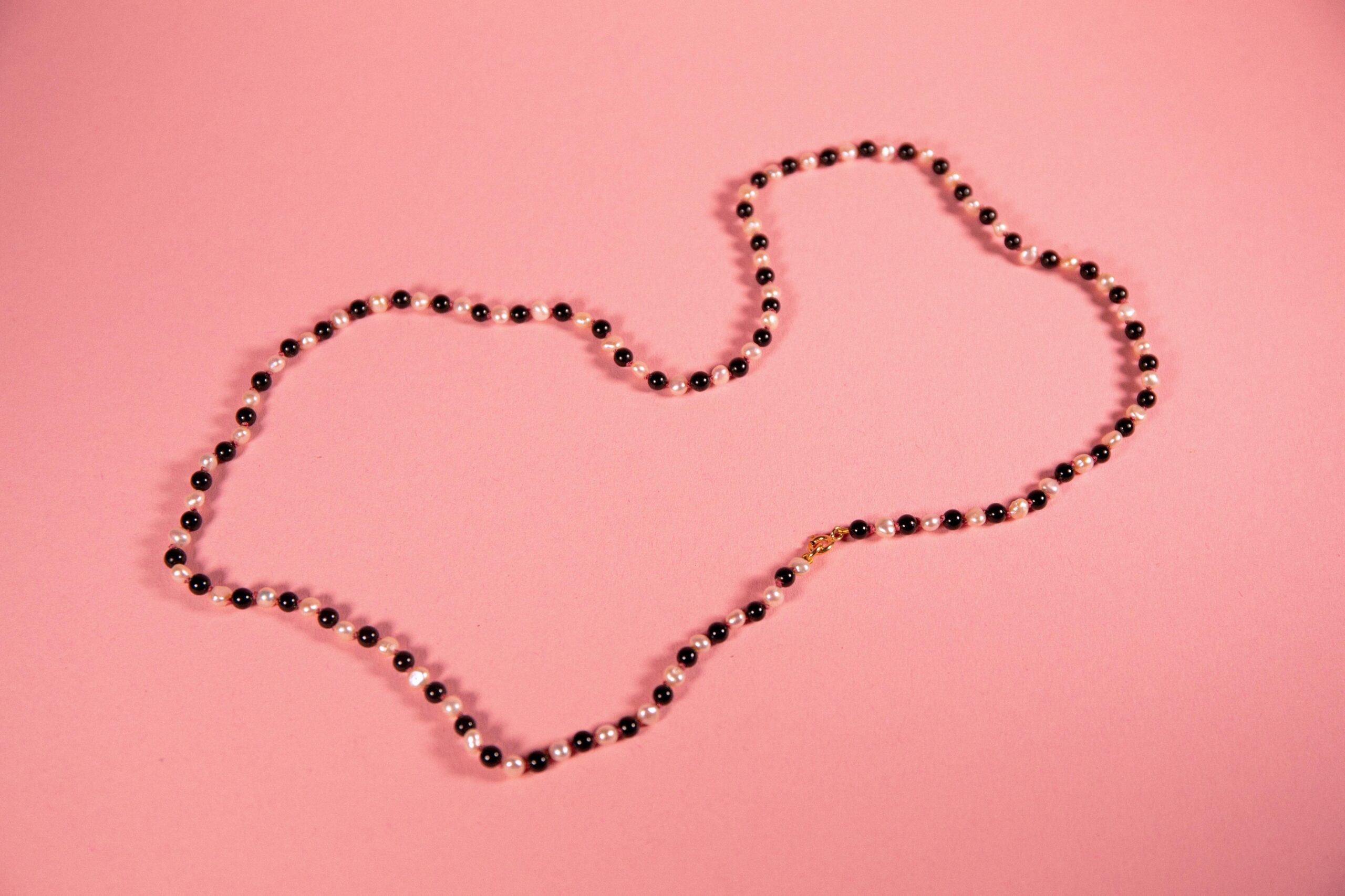 Handknotted necklace with fresh water pearls, onyx and 14k findings.