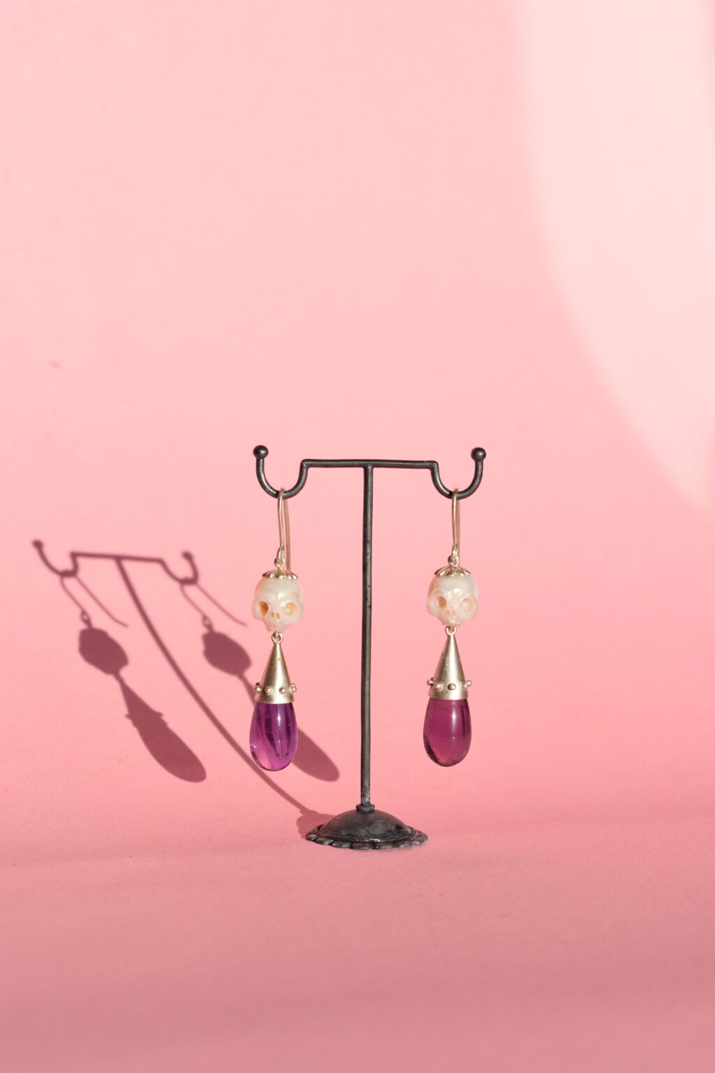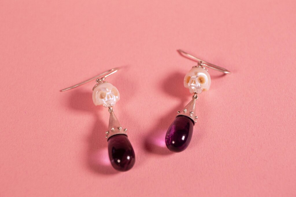This showstopper piece is an 100% hand fabricated piece to make heads turn. Two beautiful fresh water pearls, adorned with amethyst tear drops with beautiful inclusions. Made from recycled 925 Sterling silver, this piece is made to adorn the wearer with something a bit out of the ordinary. Who doesn’t want to have crying skulls hanging off their ears?